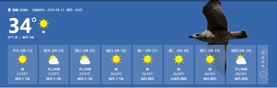 具体预报如下: 今天白天:晴天到多云。偏南风3到4级,最高气温:34℃,最低气温:27℃,空气相对湿度:50-90%; 今天晚上到明天白天:多云到晴天。偏南风3到4级,最高气温:35℃,最低气温:28℃,空气相对湿度:50-85%; 明天晚上到后天白天:晴天到多云。偏南风3到4级,最高气温:35℃,最低气温:28℃,空气相对湿度:45-90%;